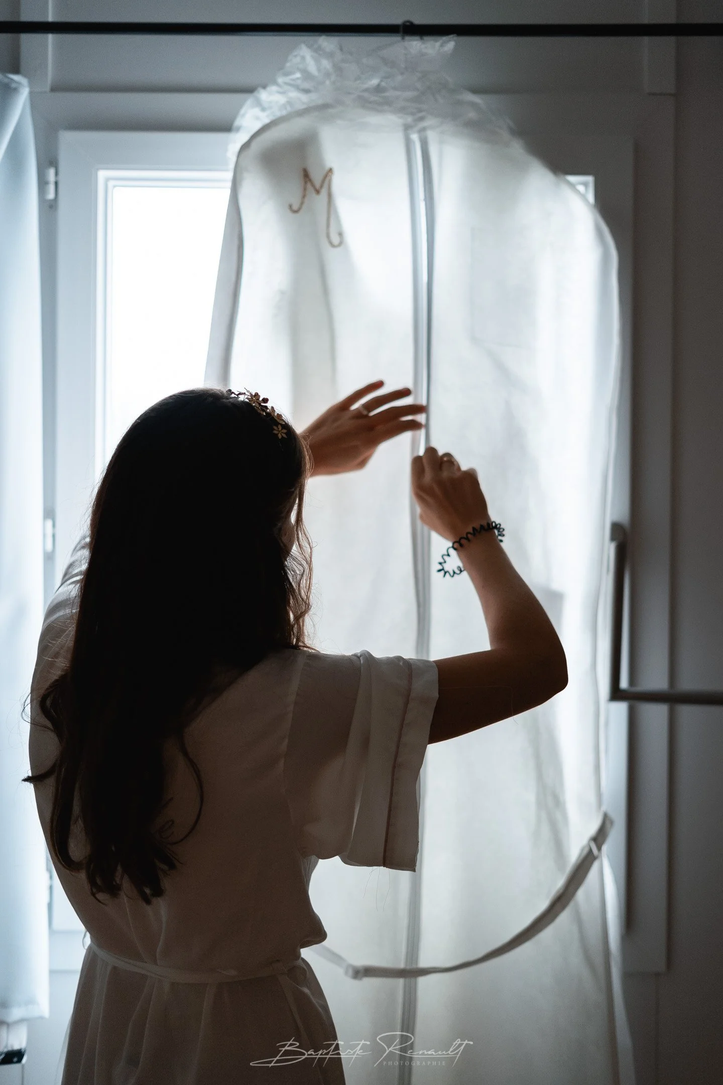 Lors du dernier essayage, nous vérifions ensemble que tout est parfait. Si nécessaire, nous essayons les accessoires, et vous pouvez repartir avec votre tenue !