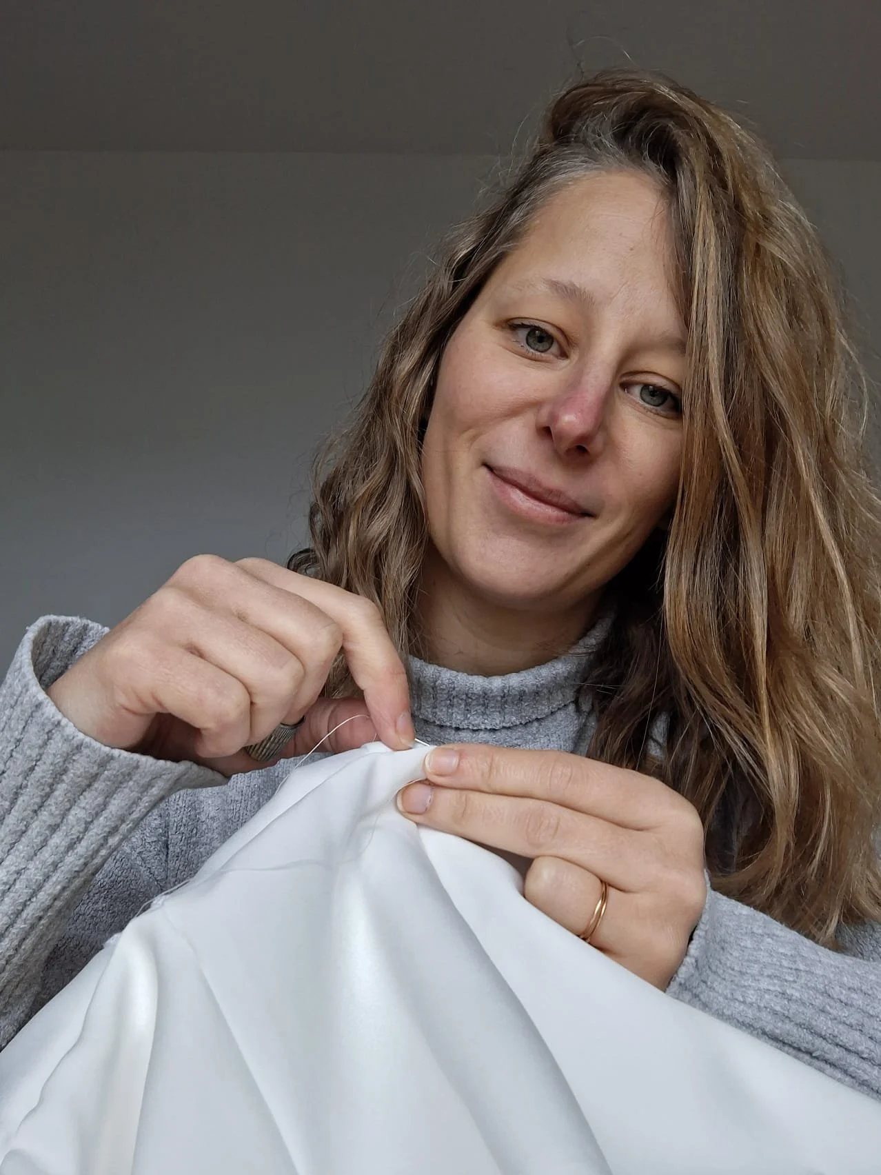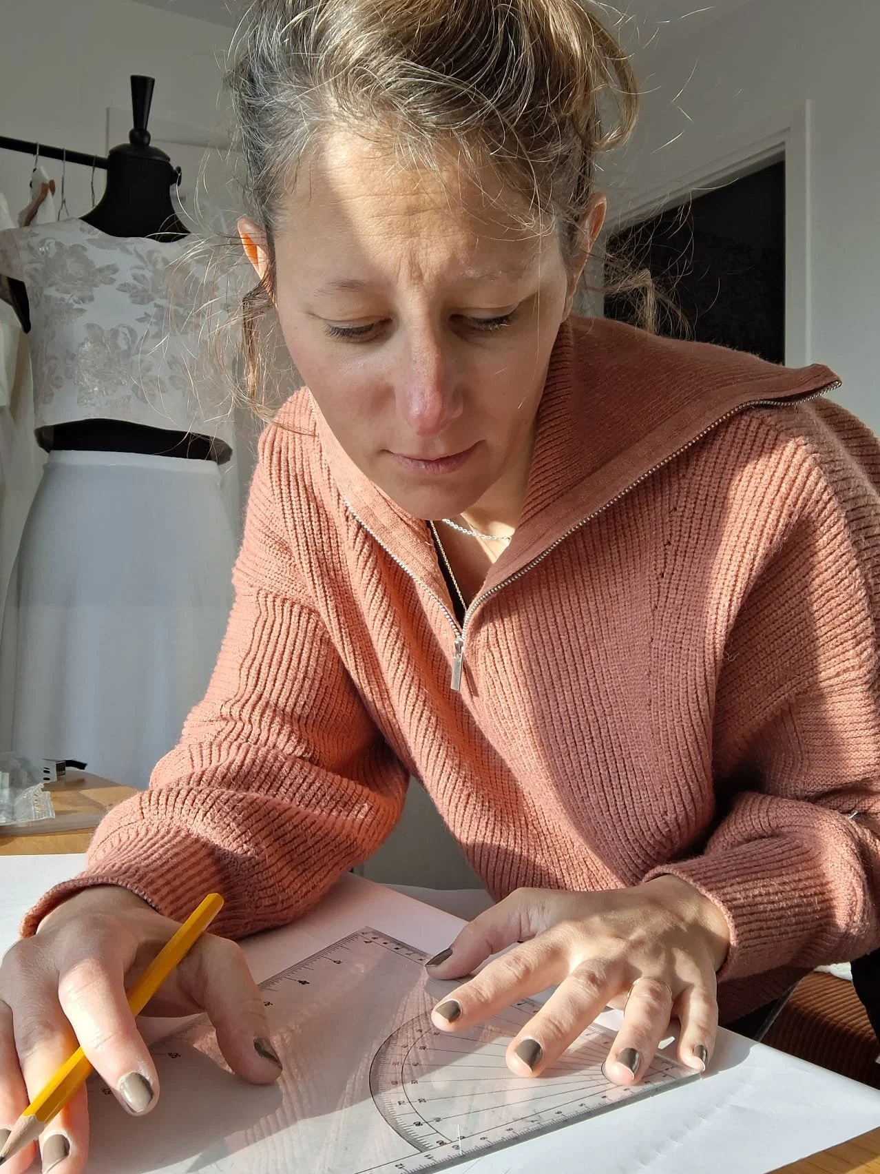 Une fois votre choix arrêté, je commence la fabrication d'un patron selon vos mensurations. Nous nous revoyons pour l'essayage de "la toile" c'est-à-dire le prototype (en coton blanc) de votre robe. Cette étape essentielle du sur-mesure nous permet de nous assurer que les lignes et les volumes répondent à vos attentes et d'apporter les ajustements nécessaires. C'est également à ce moment-là que nous finalisons le choix des matières.